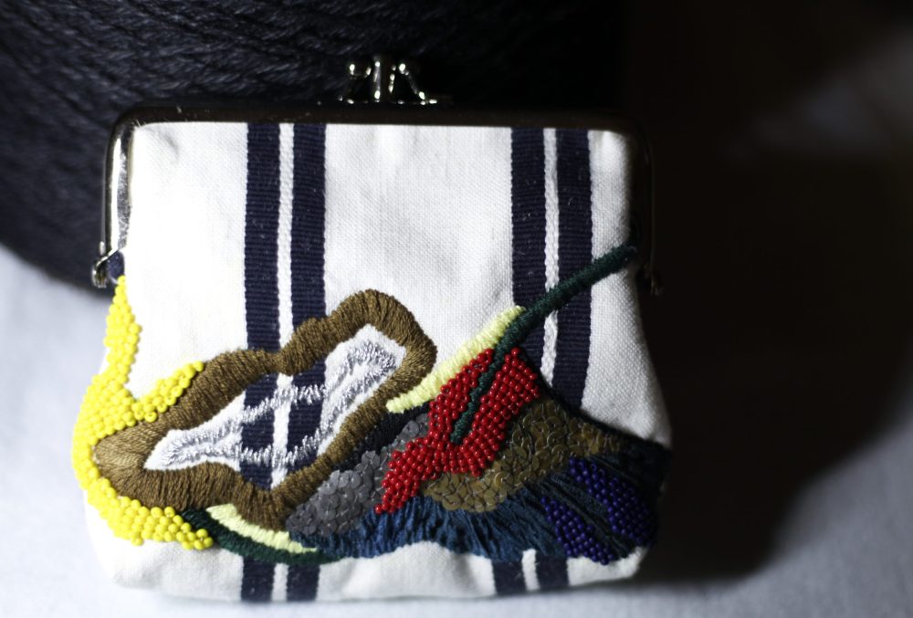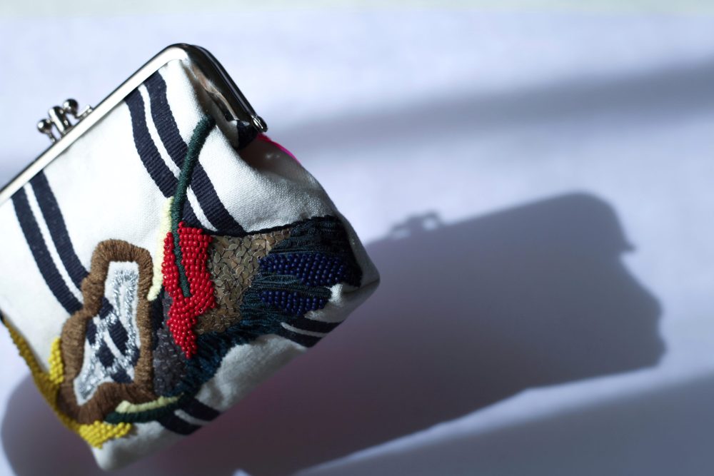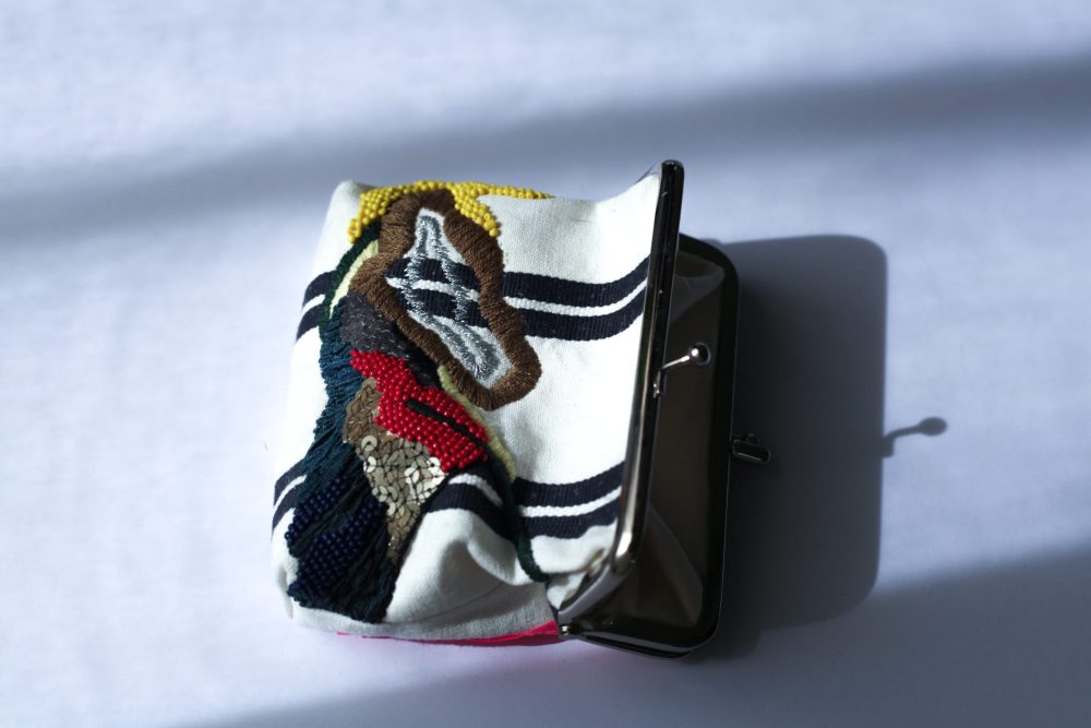 米色條紋手工刺繡口金包